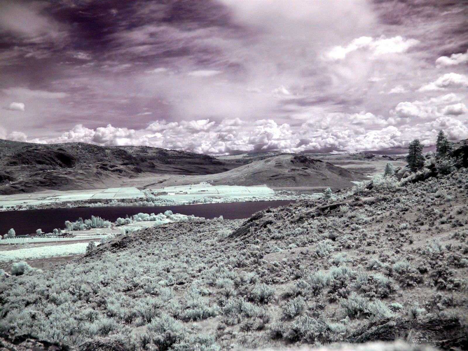 Osoyoos Lake area, WA. Imaged through the set of filters transmitting blue, read and infrared light. May 2004.