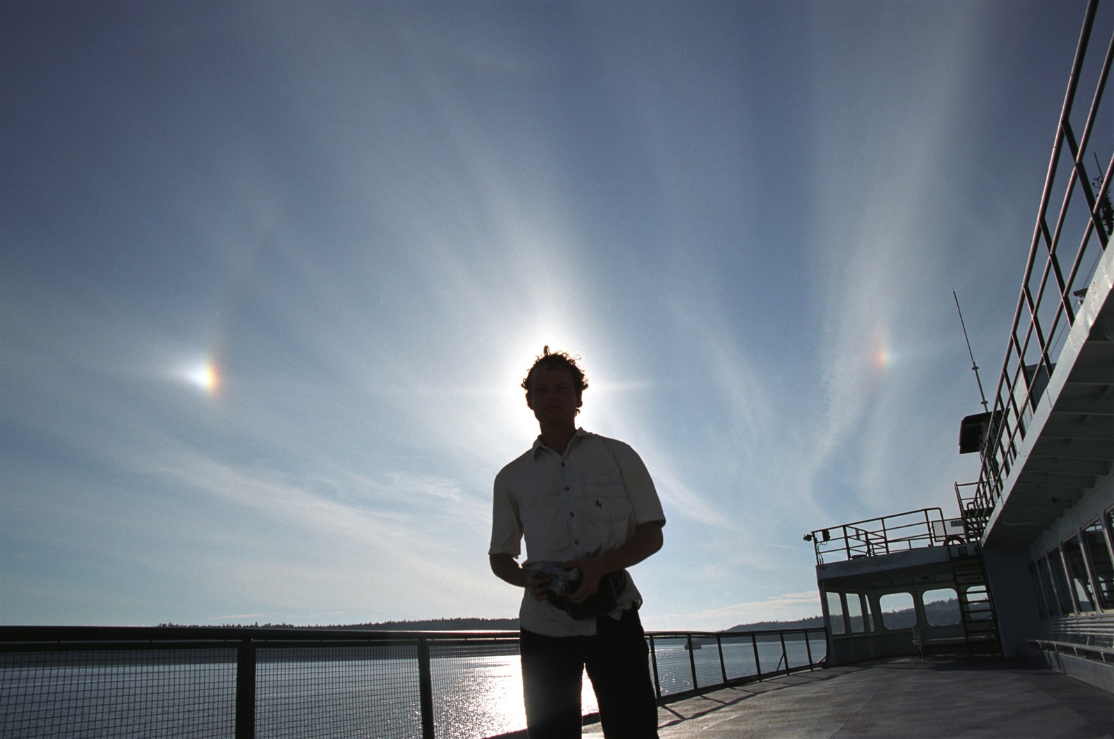 Андрей Маренич выполняет роль солнечного аттенюатора при съёмках паргелия -- занятного оптического явления в атмосфере, создающего пару ложных "солнц" по сторонам от настоящего. Снято на пароме в райное островов San Juan, лето 2004.