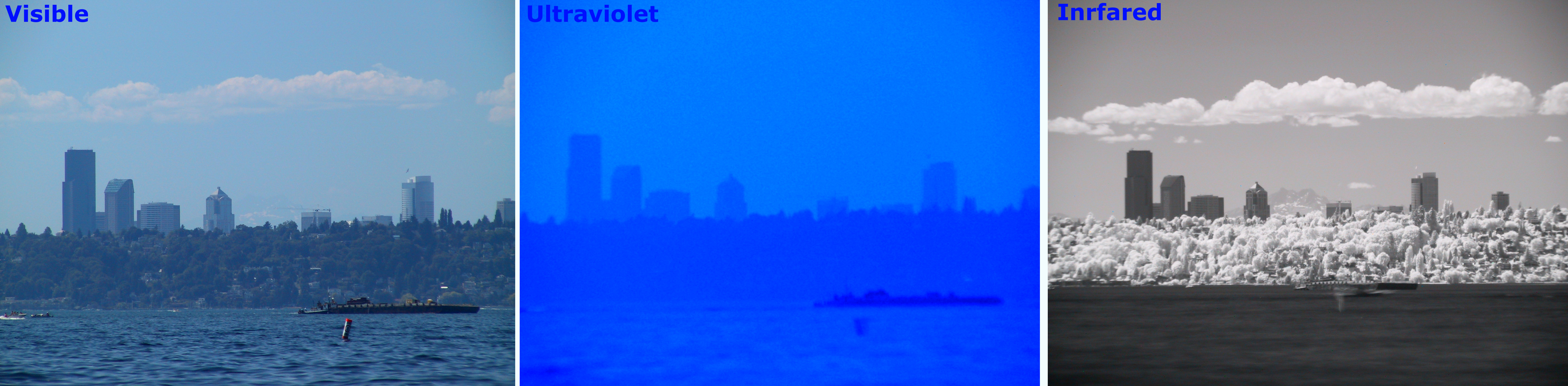 Демонстрация влияния различных оптических фильтров на результирующее изображение. Один и тот же вид Сиэттла снят в обычном видимом, близком к ультрафиолетовому (~400 нм) и инфракрасном (~900 нм) диапазонах.